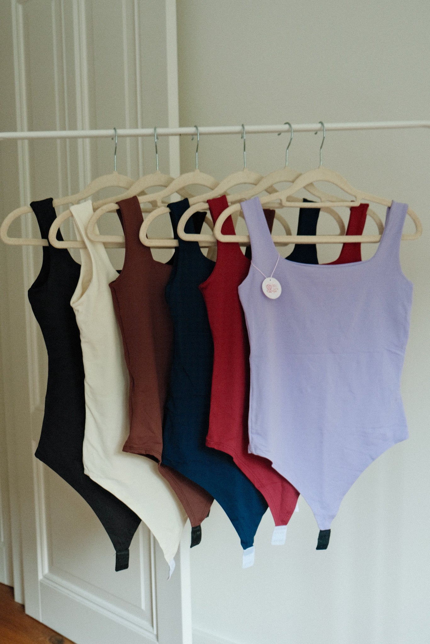 A versatile bodysuit with a square neckline. Features a snap closure for convenience. Made with lightweight polyamide and elastane, it also includes a double-layered lining for extra comfort.